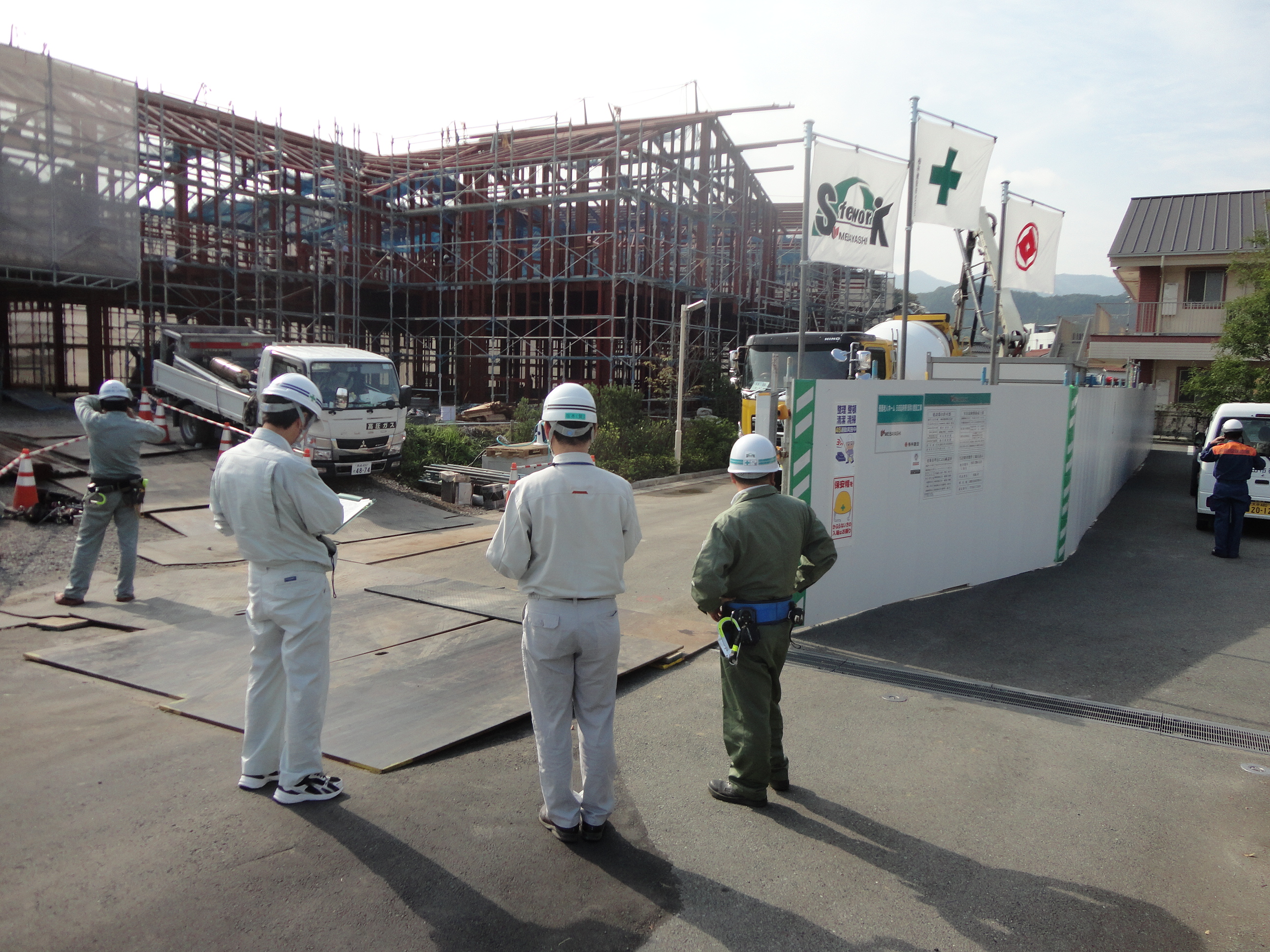 日田市では、建築指導課・建築士会・事務所協会・建設業協会・日田消防署より各1名が参加して、確認申請が届出された物件の中から5件を選考して工事中の現場を巡回しました。