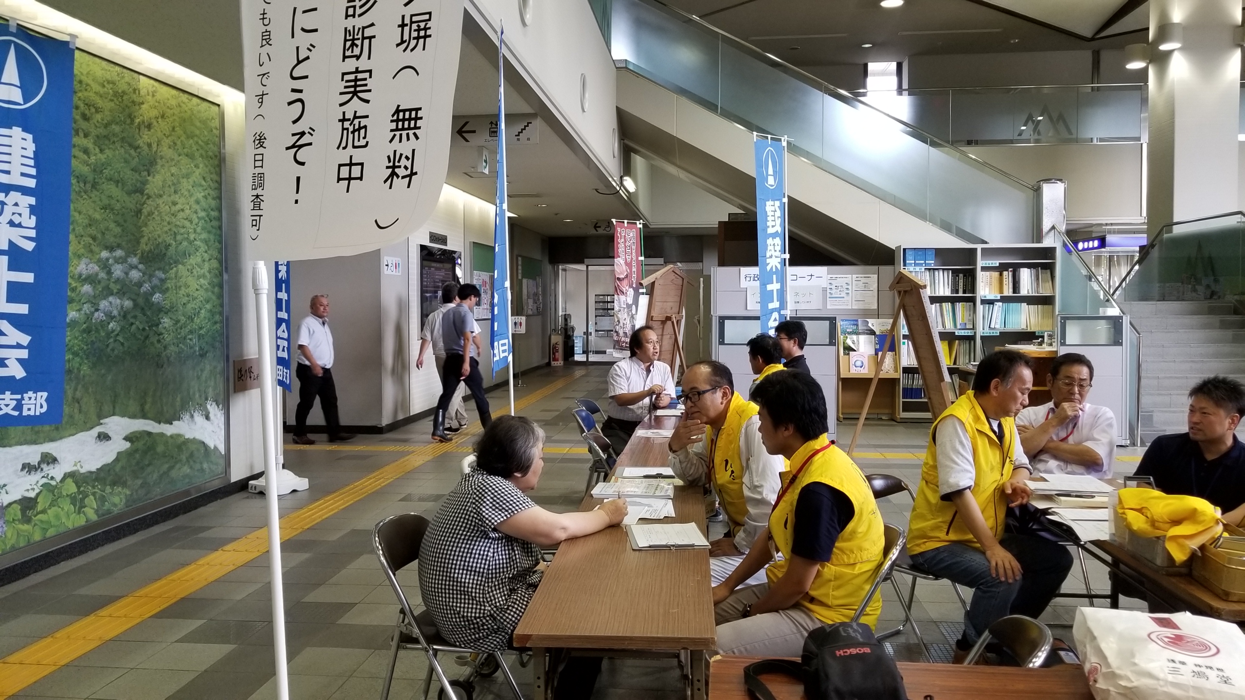7月2日、日田市役所1階ホールにおいて、大分県建築士会日田支部の主催で、住まいの無料相談会(ブロック塀の耐震診断)が開催されました。9名からの相談があり、(公社)大分県建築士会日田支部会員と日田市役所建築住宅課職員の16数名で対応しました。