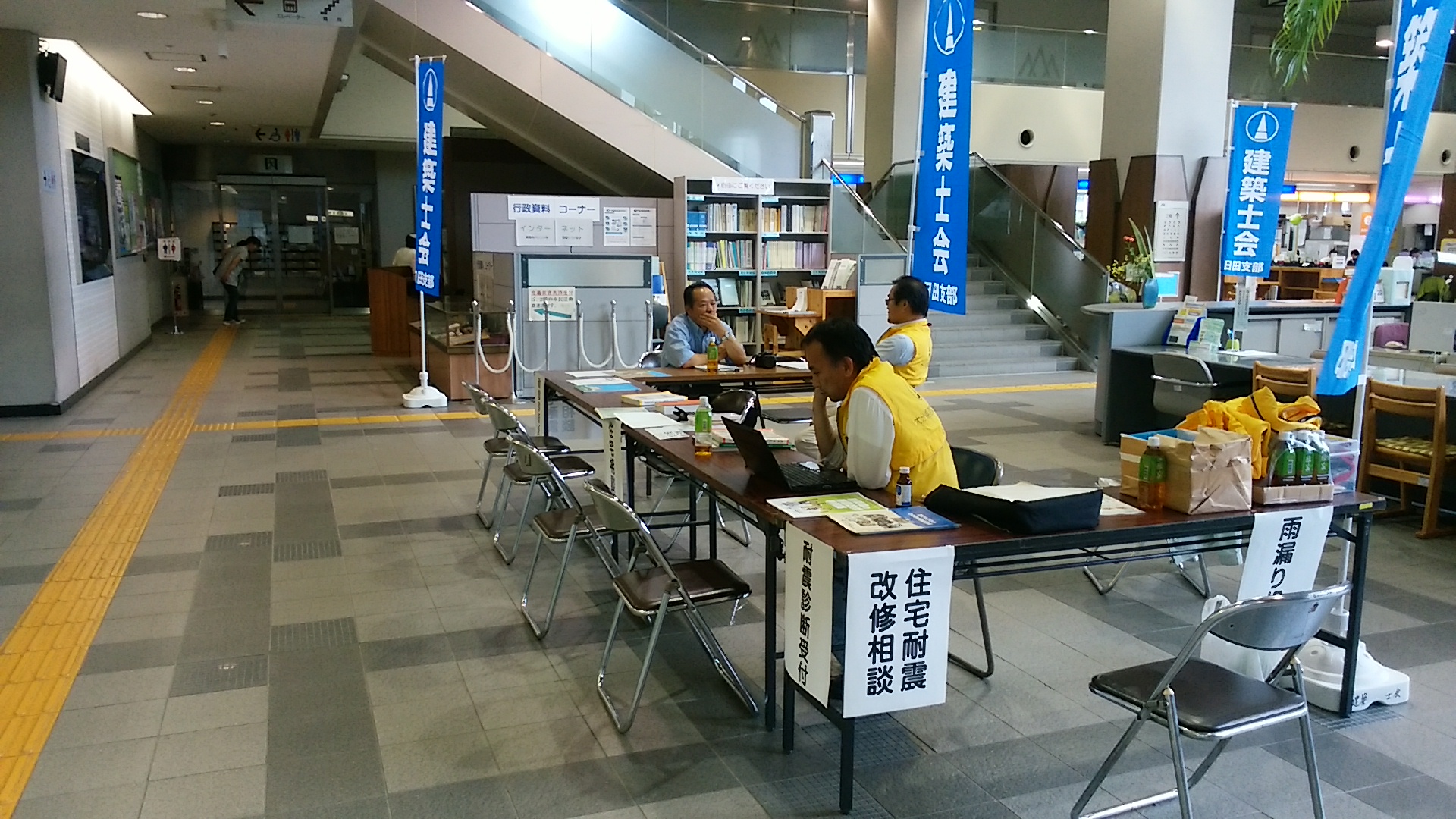 7月1日は建築士の日です。日田市役所1階ホールにおいて、大分県建築士会主催で、午前10時から住宅無料相談会が開催されました。当日は雨の降る中、数名の来場者があり、雨漏り対策や古い民家の耐震・前面道路の接道など、解決へのヒントやアドバイスを受けていました。今回の住宅無料相談会は、日田市建築住宅課指導審査係の協力を得て行われました。
