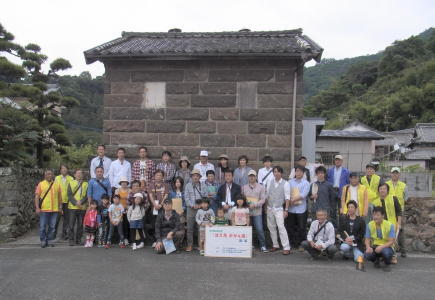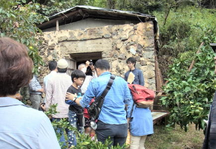 午前中は長目地区で灰石の蔵の三和土の実演解説と、みかん農園に建つ三和土の蔵を見学となりました。