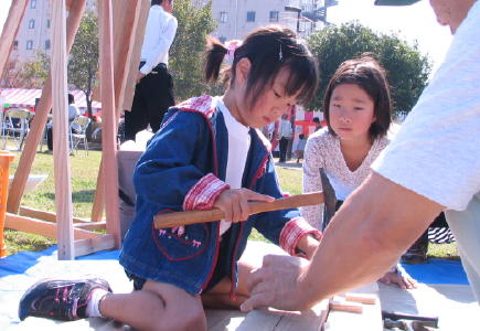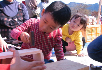 子ども達は道具を使っての体験に興味津々。釘打ちに疲れて途中休憩する子、